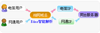 由于國(guó)內(nèi)兩大網(wǎng)絡(luò)(電信和網(wǎng)通)之間的互聯(lián)互通問(wèn)題. 導(dǎo)致電信用戶訪問(wèn)網(wǎng)通網(wǎng)站或網(wǎng)通用戶訪問(wèn)電信網(wǎng)站很慢, 為解決這個(gè)問(wèn)題, 先后有多種方案 A 給網(wǎng)站分別做電信站/網(wǎng)通站鏡像:這種實(shí)際是用戶分別在電信和網(wǎng)通租用托管1臺(tái)服務(wù)器.兩個(gè)服務(wù)器數(shù)據(jù)相同. 這樣做成本高,并且維護(hù)非常不方便. 數(shù)據(jù)無(wú)法保持實(shí)時(shí)同步. B CDN(網(wǎng)站加速) : 這種方案是有一臺(tái)服務(wù)器在電信/網(wǎng)通 緩存了 用戶網(wǎng)站數(shù)據(jù). 能夠有一定的作用.但只對(duì)靜態(tài)頁(yè)面有效,對(duì)動(dòng)態(tài)頁(yè)面無(wú)效. C 雙線主機(jī).雙線托管實(shí)際是一個(gè)機(jī)房有電信/網(wǎng)通 兩條線路接入.通過(guò)機(jī)房?jī)?nèi)部路由器設(shè)置. 實(shí)現(xiàn)電信用戶訪問(wèn)電信線路.網(wǎng)通用戶訪問(wèn)網(wǎng)通線路. 這樣實(shí)現(xiàn)電信網(wǎng)通均可以快速訪問(wèn),. D 智能雙線主機(jī):智能雙線主機(jī)是在雙線服務(wù)上的進(jìn)一步優(yōu)化. 雙線托管中效果最好的是雙IP的托管方式.也就是一個(gè)服務(wù)器同時(shí)分配電信和網(wǎng)通各一個(gè)IP地址. 然后讓電信用戶訪問(wèn)電信IP地址.網(wǎng)通用戶訪問(wèn)網(wǎng)通IP地址. 這種雙線的效果最好. 但雙IP托管中的難題 就是 如何實(shí)現(xiàn).讓電信用戶自動(dòng)訪問(wèn)電信IP地址.網(wǎng)通用戶自動(dòng)訪問(wèn)網(wǎng)通IP地址? 我們的EDNS 域名智能解析服務(wù)系統(tǒng) 就可以實(shí)現(xiàn) 域名的智能解析.用戶可以配置好電信Ip地址和網(wǎng)通IP地址.例圖如下: