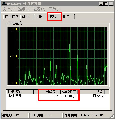 在服務(wù)器托管到機房后,您可以遠程登入服務(wù)器. 測試下載大文件. 然后查看您本機的帶寬使用情況,就可以了解您本機正使用了多少帶寬. A: 廣東電信機房測試(如果服務(wù)器在廣東 這個測試非常準(zhǔn)確): 從avl.com.cn 下載 http://benchmark.avl.com.cn/cab/avltool.exe 測試工具. 在服務(wù)器運行這個工具. 點擊 測試網(wǎng)站速率 然后在"開始"->"運行", 輸入 "taskmgr",出現(xiàn) window任務(wù)管理器, 選擇 "聯(lián)網(wǎng)" 就可以看到 服務(wù)器帶寬占用情況.以下圖為例,表示帶寬是 1M帶寬 (0.01*100).