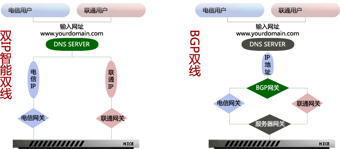 雙IP智能雙線需要設置兩個IP地址,最佳訪問路由是由域名DNS服務器根據訪問者的登陸IP來確定的。 相比雙IP智能解析,BGP雙線服務器在骨干路由決定最佳路由時,有可能由于網間路由跳轉次數比較多,訪問的速度比雙IP智能雙線慢一點;而雙IP智能雙線由于是軟件決定,有可能由于軟件數據庫不完整或者IP數據的變更造成的自動識別錯誤。 總之BGP雙線與雙IP智能雙線各有千秋,各有優勢,在解決中國南北電信問題上都充當著重要的角色。 |